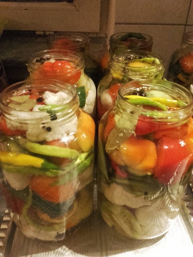 A nyár ízeit tettem el télire. Vegyes savanyúság: alma paprika, karfiol, gyöngyhagyma, uborka, zödparadicsom, kospaprika, cseresznyepaprika