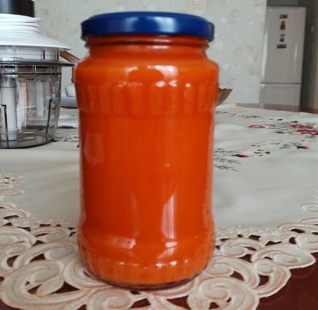A zúzott fokhagymát, a cukrot, a sót és az olajat hozzáadjuk és jól összekeverjük. A zöldséges keveréket közepes erősségű hőfokon főzzük 60 percig, időnként kavargassuk Majd adjuk hozzá a csípős pirospaprikát és a dzsemfixeket, alapos kavarás után turmixoljuk. Ezután főzzük még 10 percig.