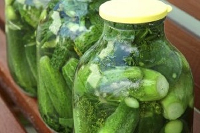 Közepes és közepesnél kisebb uborkákat alaposan megtisztítunk, végeit levágjuk, és húsát éles késsel bevagdaljuk. Üvegekbe rakjuk. Egy 5 literes üvegb
