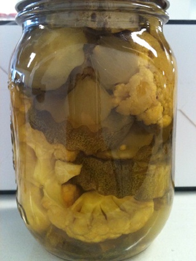 Hozzávalók: 1 kg apró szemű vöröshagyma, 1 kg apró zöldparadicsom, 1 kg karfiol, 5-6 szem cseresznyepaprika, másfél csésze ecet, 1-2 csésze cukor, 9 csésze víz, 2-3 szál kapor, egy fél csomag mustármag, szőlő- és meggylevél, 1 kiskanál szalicil, 1 mokkáskanál borkénpor.